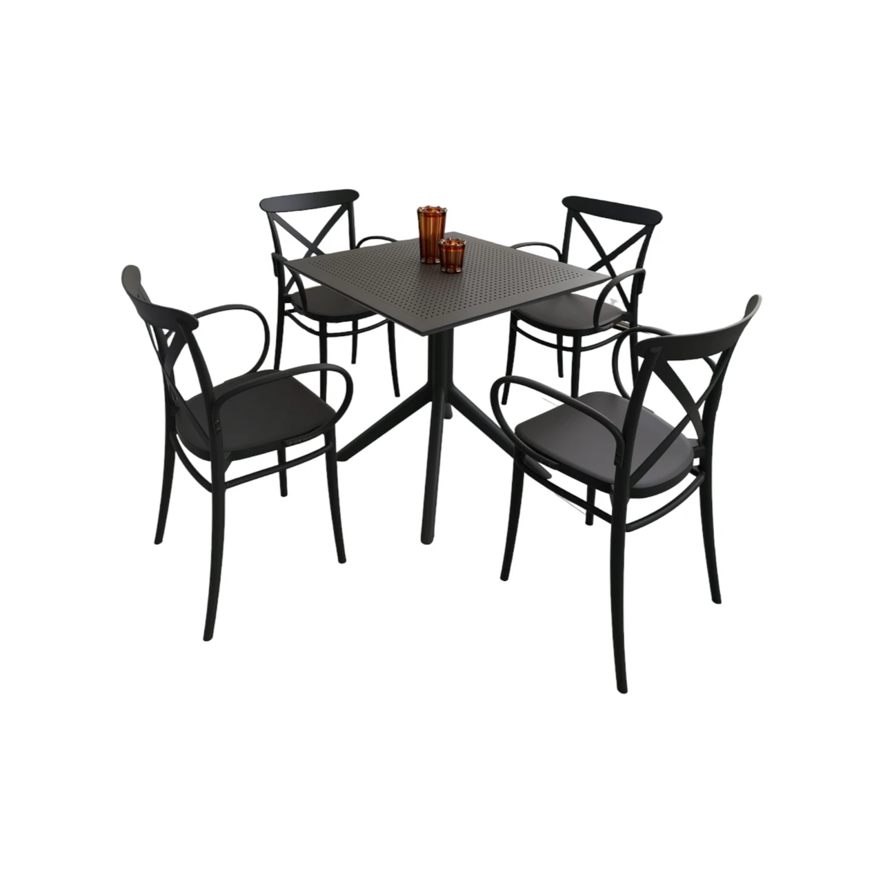 Includes (4) armchairs and (1) square table