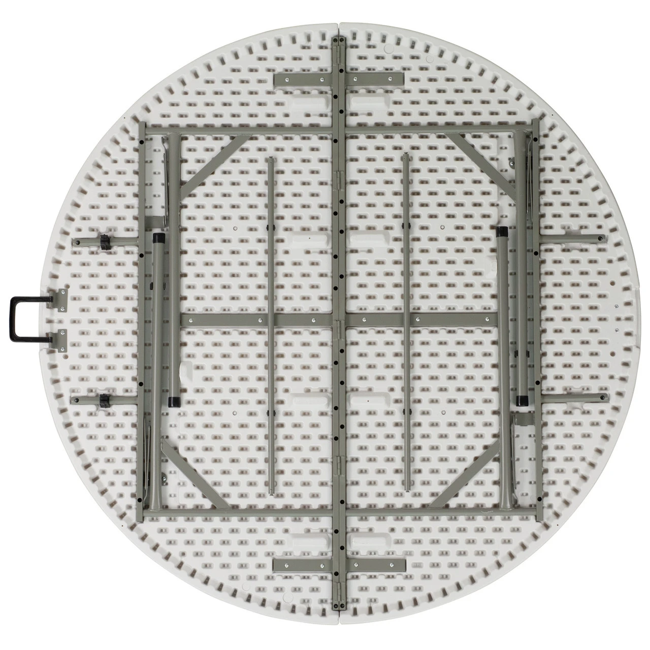 White and black round folding table with carrying handle