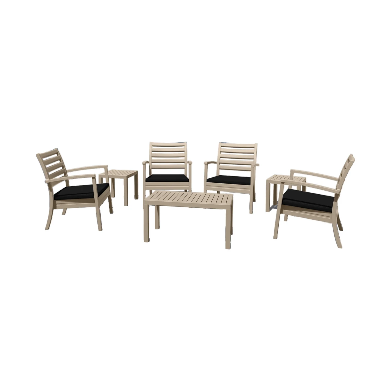 Includes four club armchairs, two square side tables and one rectangle coffee table