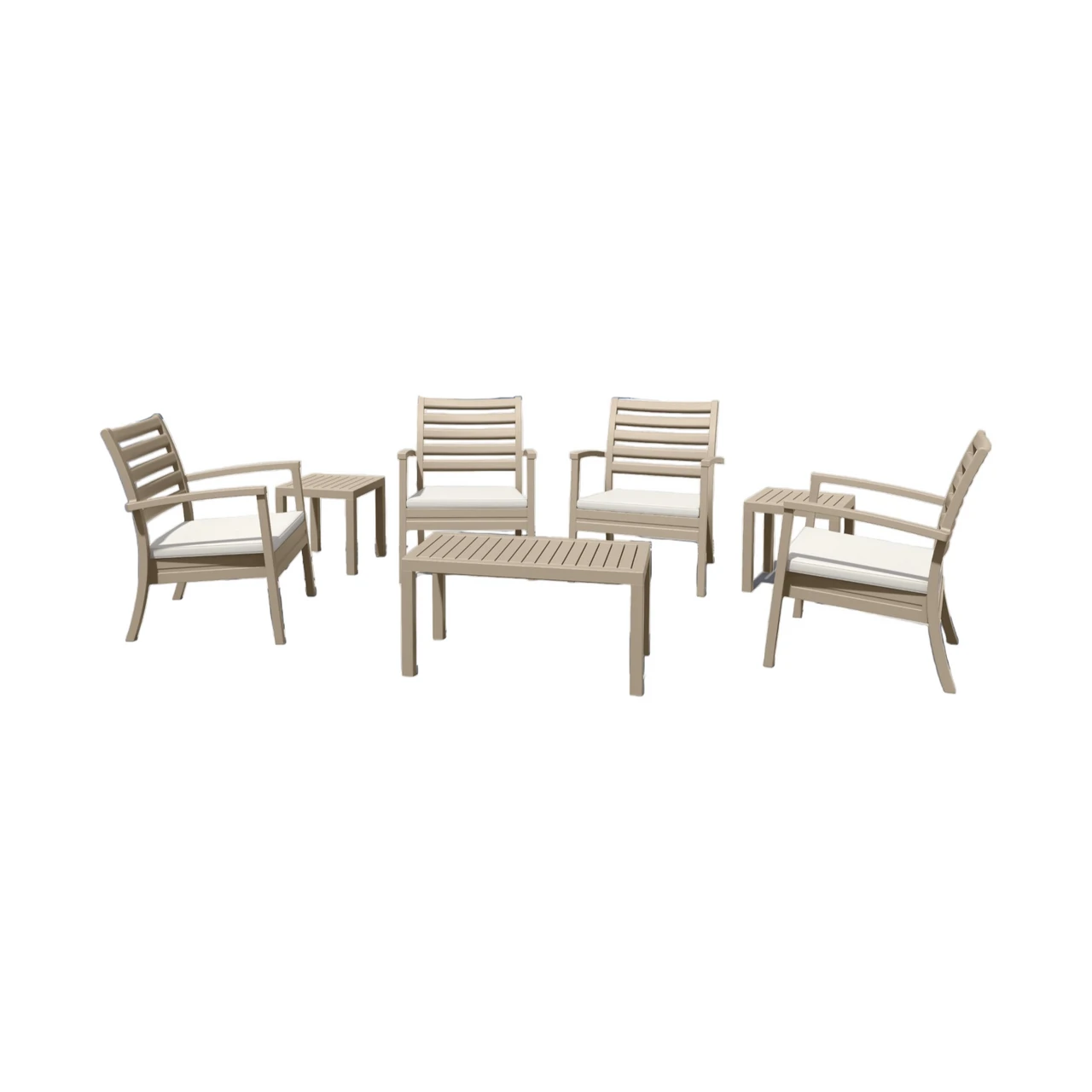 Includes four club armchairs, two square side tables and one rectangle coffee table