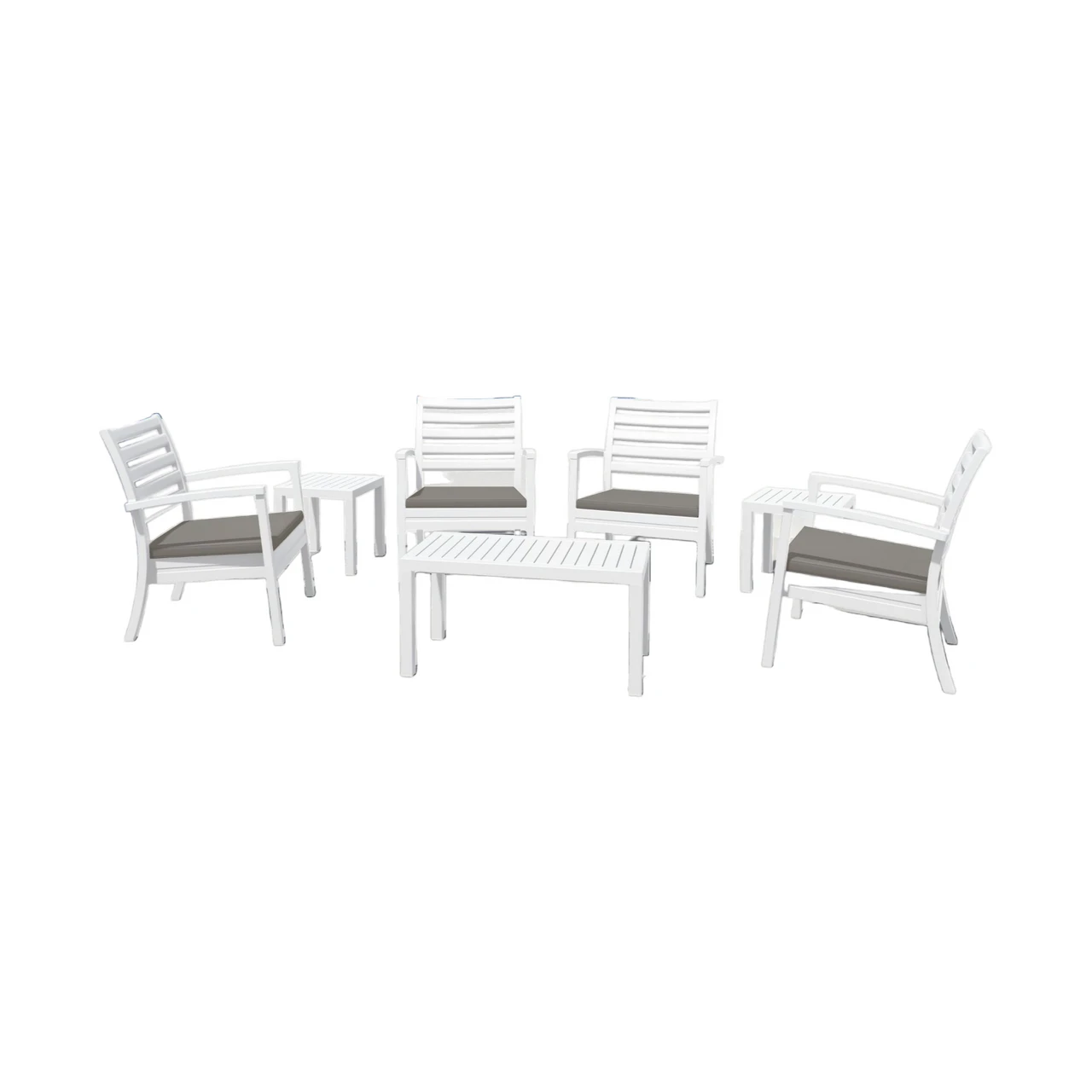 Includes four club armchairs, two square side tables and one rectangle coffee table